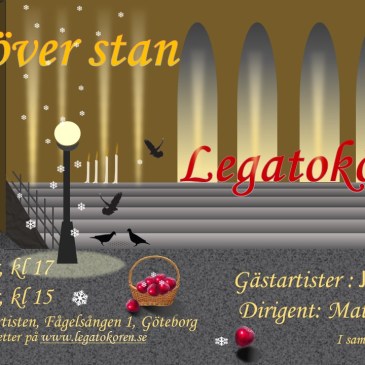 Legatokörens klassiska julkonsert. I år har vi glädjen att samarbeta med folkmusikgruppen JAERV – läs mer på http://www.jaerv.com 1a Advent 1/12 kl 17.00 2a Advent 8/12 kl 15.00 Biljettpris 200kr Barnbiljett 50kr upp till 12 år Beställ biljetter via SimpleSignup, alternativt – för biljetter eller mer info maila oss gärna på info@legatokoren.se